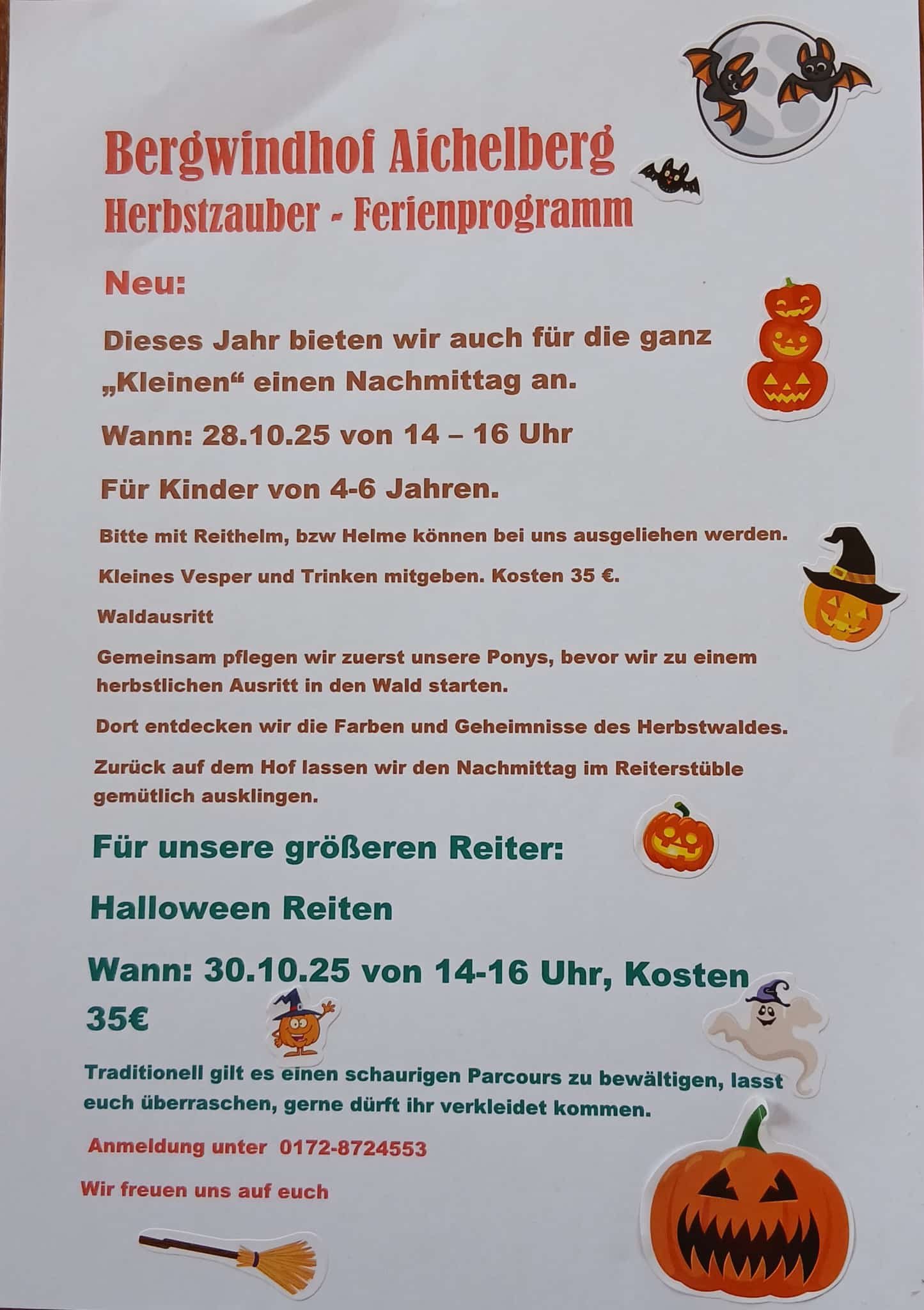 Die Kurse erstreckt sich jeweils über den ganzen Tag, beinhalten sowohl theoretischen als auch vor allem praktischen Unterricht und werden von gemeinsamen Essenspausen unterbrochen. Die Teilnehmer reiten auf dem Platz bzw. in der Halle, machen geführte Ausritte in die Umgebung des Bergwindhofs rund um Aichelberg, Waldnachmittag, LandArt-Projekt und es entstehen Kunstwerke aus Naturmaterialien. Am letzten Nachmittag findet eine Vorführung der Ferienreiter/innen für ihre Eltern, Geschwister und andere interessierte Verwandte und Freunde mit anschließendem Abschlussfest statt. Für jeden Teilnehmer/in gibt es außerdem eine tolle Urkunde.